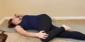 Take a few breaths here or right away with your next exhale guide your knee over your body to the right side of your body. This movement allows your spine to twist. Move with caution and listen carefully to your body. Over time your knee may touch the floor.